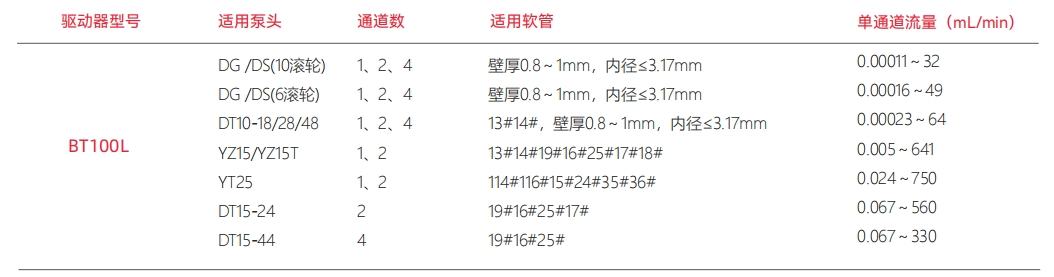 以上适用泵头、适配通道数和单通道流量等数据,均为实验室常温常压条件下用雷弗硅胶管打纯净水测试所得,此数据仅供参考; 实际使用时由于受压力、温度、介质特性、软管材质等具体因素的影响,具体情况需要咨询雷弗工程师。