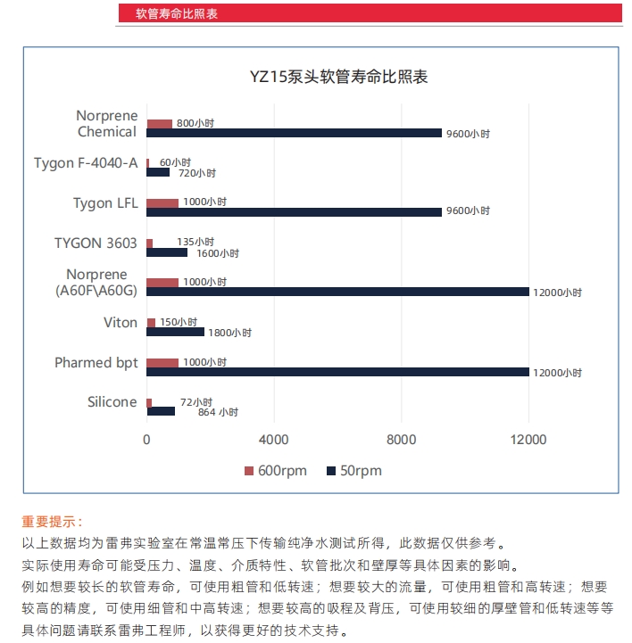 YZ15泵头流量范围0.005~2562毫升/分钟,适合13#、14#、19#、16#、25#、17#、 18#泵管,流量范围非常宽泛;