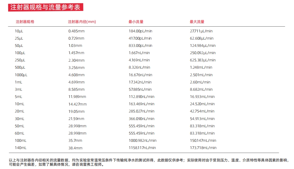 以上与注射器各内径相关的流量数据,均为实验室常温常压条件下传输纯净水的测试所得,此数据仅供参考;实际使用时由于受到压力、温度、介质特性等具体因素的影响, 可能会产生偏差,如需了解具体情况,请咨询雷弗工程师。